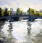 2006Uit de zesdelige serie 'bruggen over de Amstel' is dit de Berlagebrug, geschilderd met dunne olieverf die het ijle karakter van lucht en water het best benadert.